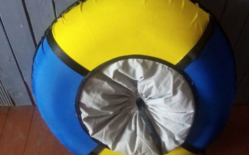 Niños atacaron a niño por un trineo inflable en azul y amarillo.