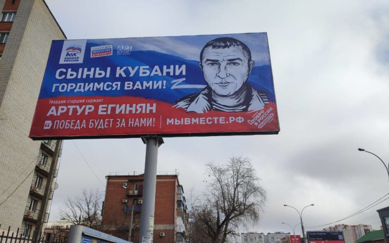 En Krasnodar, se instaló una valla publicitaria con el ocupante Artur Yeginyan, quien murió en la guerra contra Ucrania, quien fue condenado hace varios años por golpear a su hermano con una tauretka.
