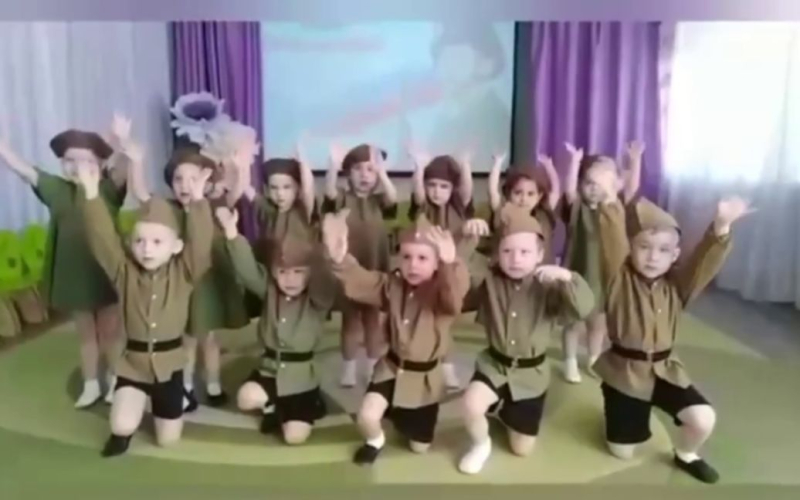 Los niños estaban vestidos de ejército uniformes de la Segunda Guerra Mundial, obligados a marchar con las manos a la espalda y bailar con banderas rusas. Luego organizaron un “juego” militar: arrojar granadas a los tanques enemigos, aunque eran fotografías impresas en papel A4.
