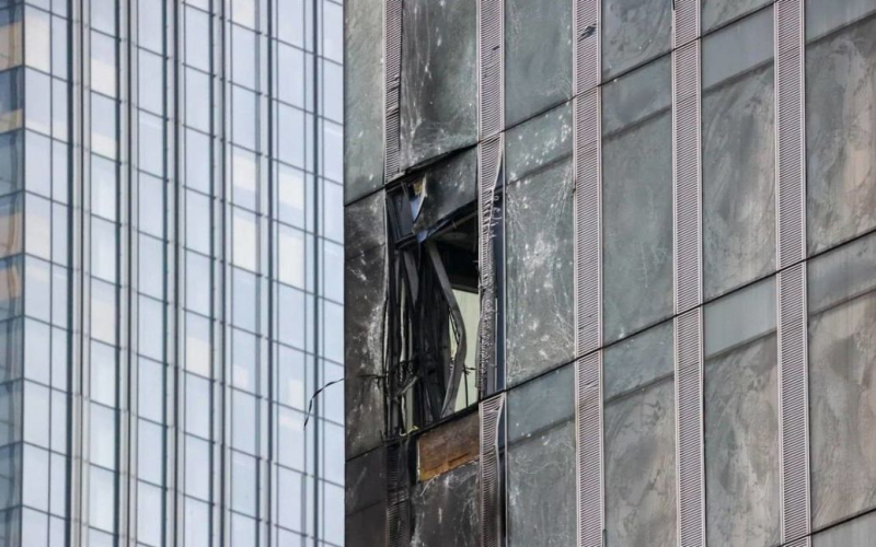 Total < El área de destrucción en el rascacielos es de 100 metros cuadrados. m. Se rompieron los cristales de cinco marcos de ventanas en el piso 11, tres en el 12, dos en el 13 y uno en el 14. En total, 11 ventanas resultaron dañadas. En el interior del edificio no se encontraron los restos del dron derribado mediante guerra electrónica, sino que cayeron. Nadie resultó herido.