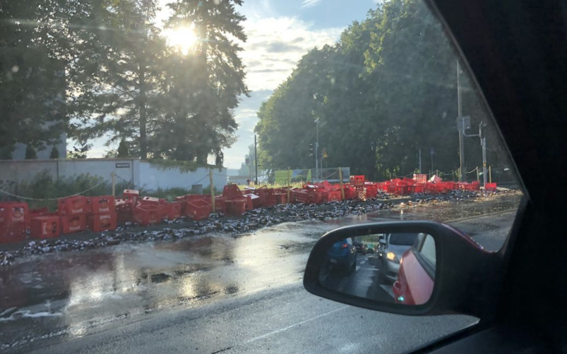 Un accidente inusual en una de las intersecciones de Poznan. Cerca de la calle Brovarnaya, de un camión se cayeron cajas con casi siete mil botellas de cerveza. La bebida inundó la calzada y el conductor del vehículo recibió una cuantiosa multa.