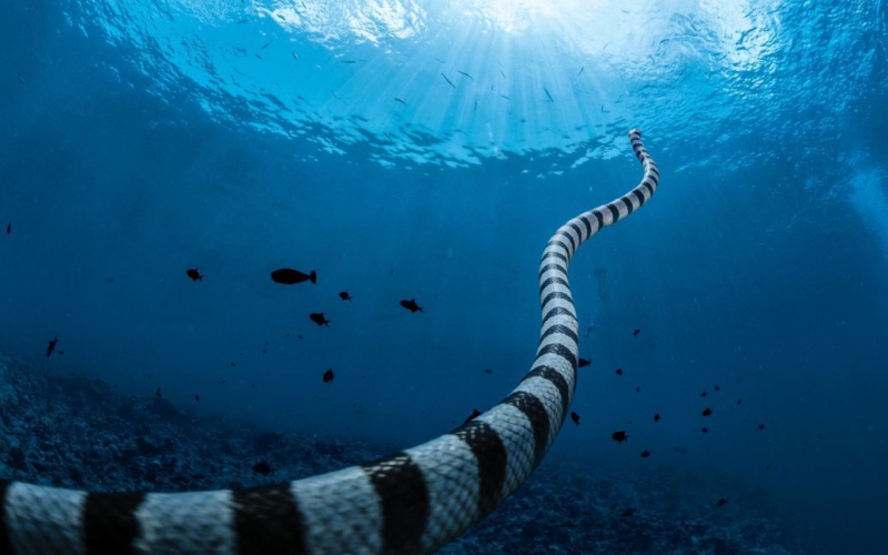 La foto muestra un mortífero krait marino rayado nadando hacia la superficie del Océano Pacífico para respirar. La criatura fue filmada dentro del Santuario Marino de Palau. La reserva marina se inauguró en 2015. Es el sexto más grande del mundo. La foto apareció en la portada de la revista, que ya cumple 135 años.