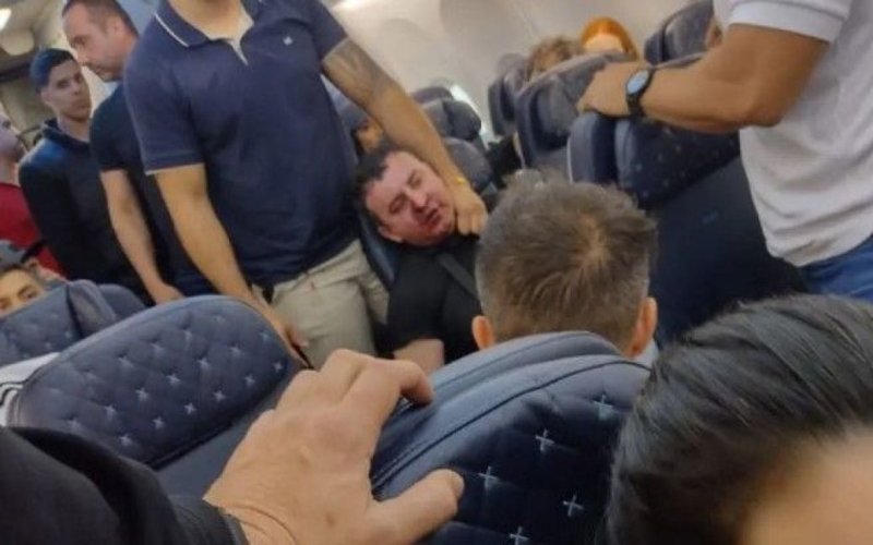 Las imágenes adjuntas muestran a los pasajeros sosteniendo a un hombre, cuyo rostro está ensangrentado, mientras los miembros de la tripulación le atan la muñeca.