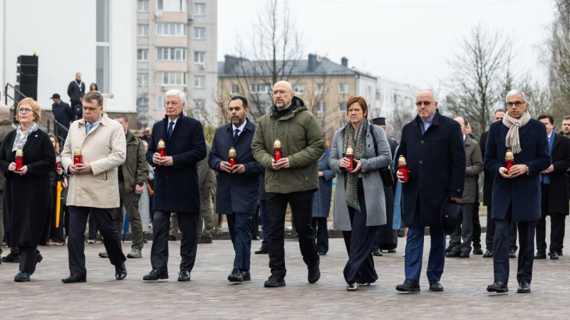 como el Primer Ministro de Ucrania Denis Shmygal, los parlamentarios europeos se unieron a la memoria de los muertos en Bucca con ocasión del aniversario de la liberación de la ciudad.